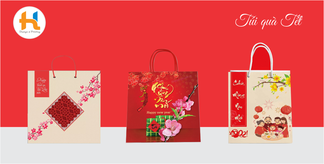 Mẫu túi đựng quà TẾT, thiết kế chủ yếu tông đỏ vàng biểu trưng cho tài lộc may mắn.