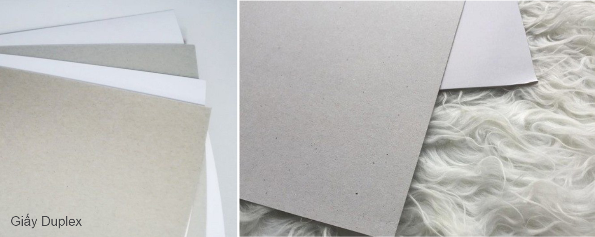 Giấy Duplex được sử dụng phổ biến với sản phẩm nhu cầu giá rẻ. Giấy có 1 mặt trắng, láng mịn, mặt còn lại màu xám, sẫm hơi sần. Khi in hộp mặt giấy láng mịn sẽ được in hình ảnh nội dung và là mặt ngoài của sản phẩm, mặt bên trong là mặt tối mầu.