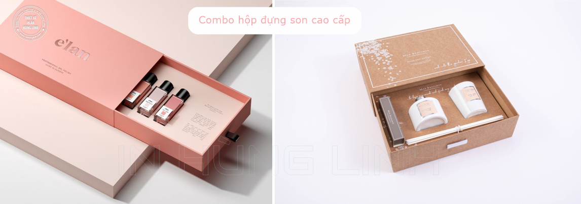 - Nếu khách hàng muốn làm hộp giấy đựng thỏi son có khay bên trong thì vui lòng gửi mẫu thỏi son, kỹ thuật của In Hùng Linh sẽ tính toán kích thước sao cho phù hợp nhất. Các set son dùng làm quà tặng thường được bán thẹo bộ vào gồm nhiều loại nên cần được làm khay, hoặc có thể làm thêm túi xách đựng vỏ hộp sẽ rất bắt mắt và chuyên nghiệp.